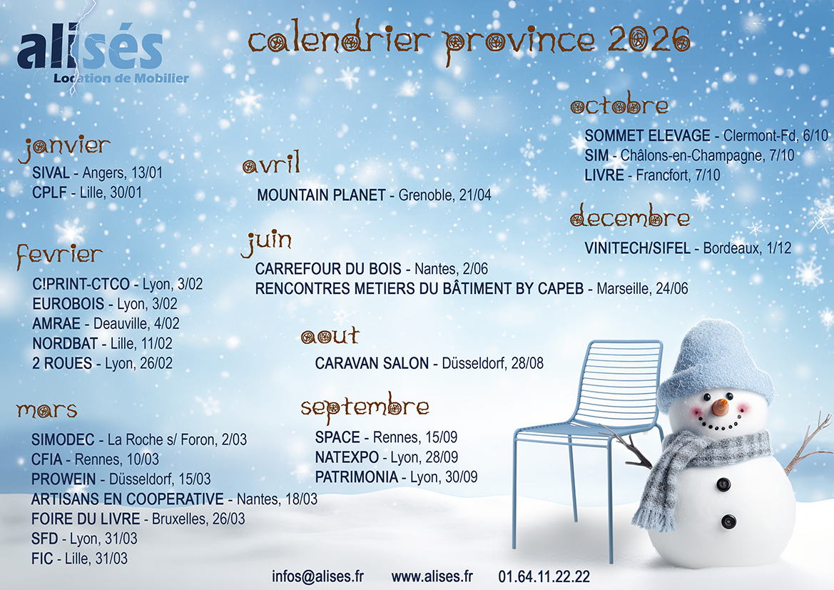 alisés est très heureux d'être le partenaire officiel de location de mobilier pour le Salon des Véhicules de Loisirs, qui se déroulera du 27 septembre au 5 octobre 2025, au parc des expositions Paris - Le Bourget.
